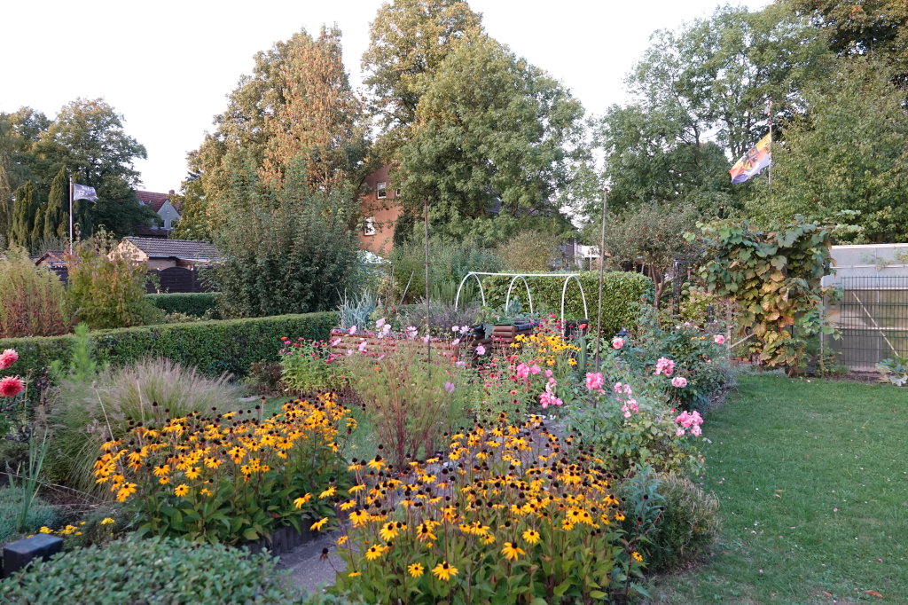 Schon um 7.30 Uhr starteten wir bei strahlendem Sonnenschein unsere Fahrt ins schöne Münsterland. Unser erster Halt war der Garten „Hortus Vivendi“, was so viel bedeutet wie „Garten zum Leben“ in dem kleinen Ort Rinkerode bei Drensteinfurt. Gärtnermeisterin Barbara Gerlach und ihr Mann begrüßten uns herzlich auf ihrem 1400 m² großen Grundstück. Viele kreative Ecken zum Entdecken im Vintage-Garten ließen unsere Gärtnerherzen gleich höherschlagen. Frau Gerlach erwies sich als unermüdliche Sammlerin von Trödel, alten Metallwannen, Schalen, Kannen, Eimern und Geschirr, aber auch verwittertem Holz, Steinen und sogar Dachpfannen, die sie kunstvoll in ihren Garten integriert hat. Der vordere Teil ist gekennzeichnet durch zahlreiche Gehölze, die in Zeiten des Klimawandels für ausreichend Schatten sorgen.