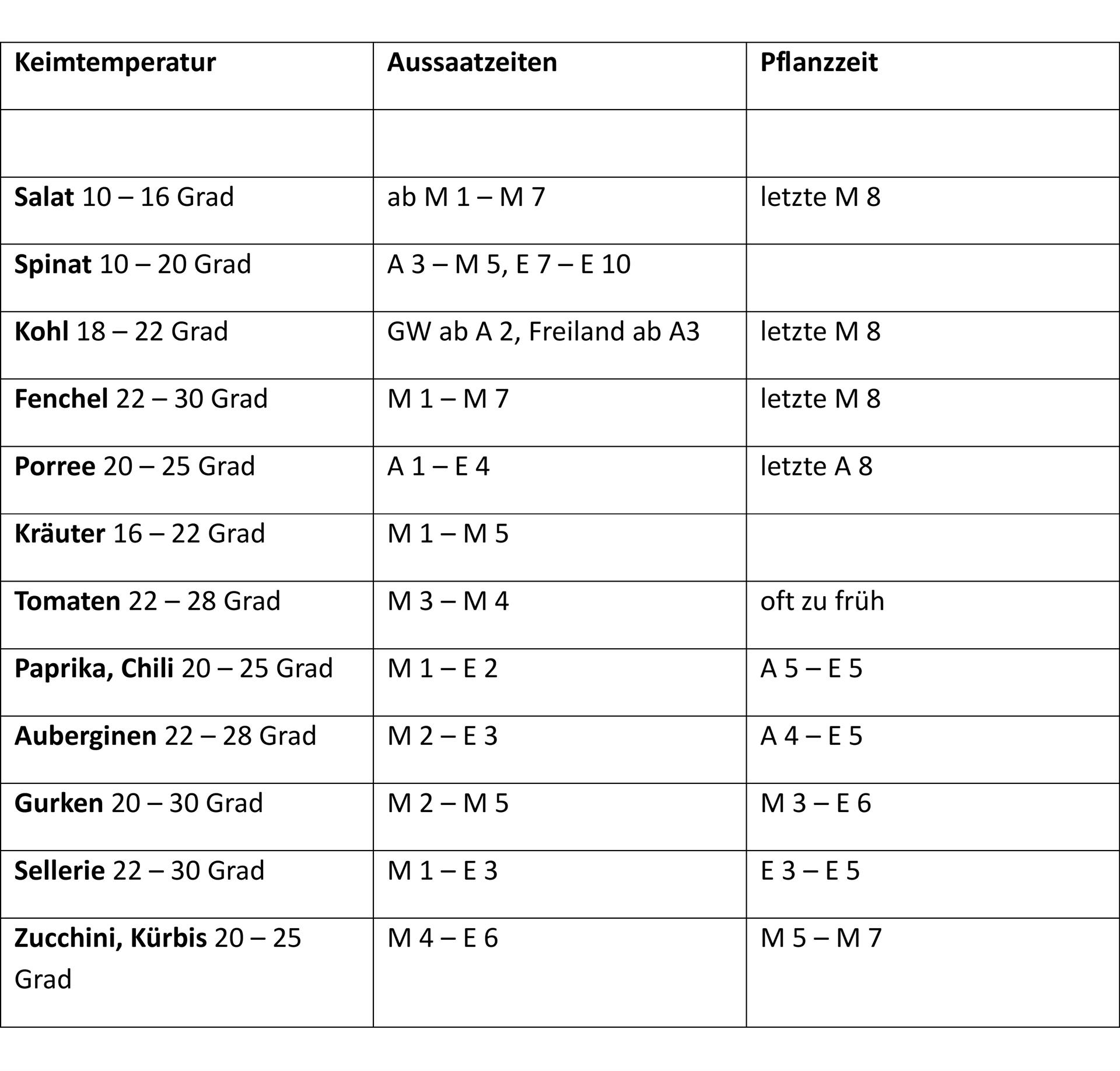 Anzucht: Die Samen werden im Gewächshaus vorkultiviert, zunächst in flachen Kästen flächig ausgesät, später in größere Kästen pikiert und anschließend ausgepflanzt. Nach dem Pikieren werden die Jungpflanzen im Folientunnel abgehärtet. Entscheidend für den Erfolg ist die Beachtung der Keimtemperatur, die richtige Aussaatzeit und die Pflanzzeit. (siehe Tabelle). Sät man zu früh, erhält man lange dünne Triebe und keine kräftigen Pflanzen. Um Unkraut zu vermeiden, pflanzt man im Erwerbsanbau unter schwarzem Flies und wässert mit Tröpfchenbewässerung. Wasser soll nur an die Wurzeln gelangen. Gelbtafeln schützen vor Fluginsekten.