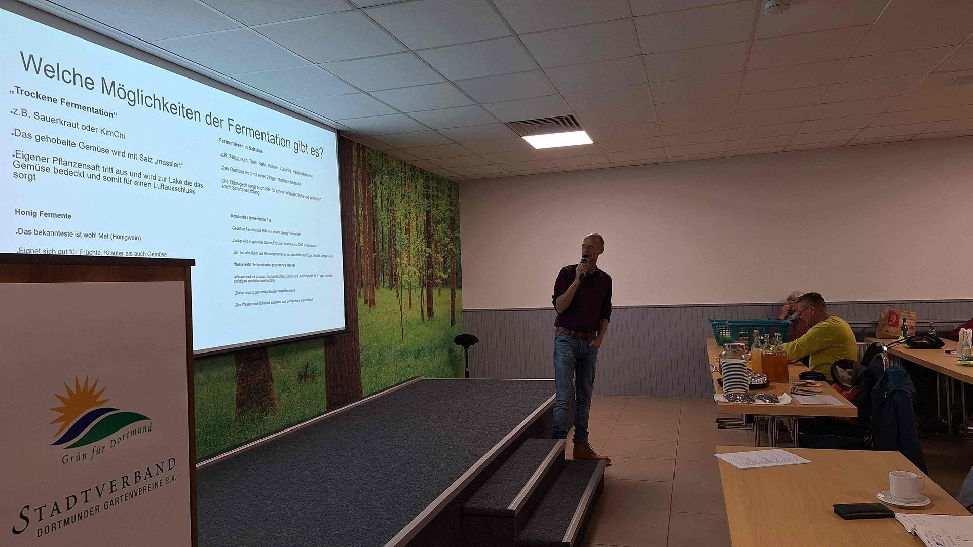 Am 17. Oktober 2025 fand im Verbandshaus eine Gartenfachberatung zum Thema Fermentierung statt, die auf reges Interesse stieß: Rund 50 engagierte Gärtnerinnen und Gärtner nahmen an der Veranstaltung teil. Gartenfreund Heiko Belz vom Gartenverein Lütgendortmund Nord e. V. referierte über seine praktischen Erfahrungen zur Konservierung von Gartenerzeugnissen durch Fermentation.