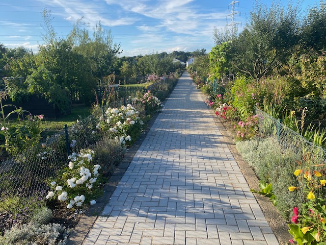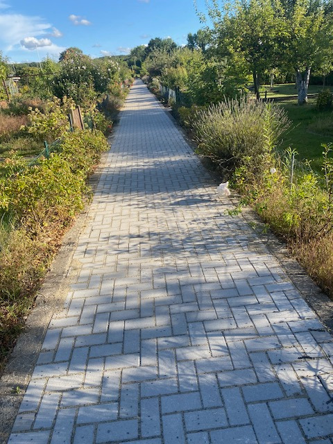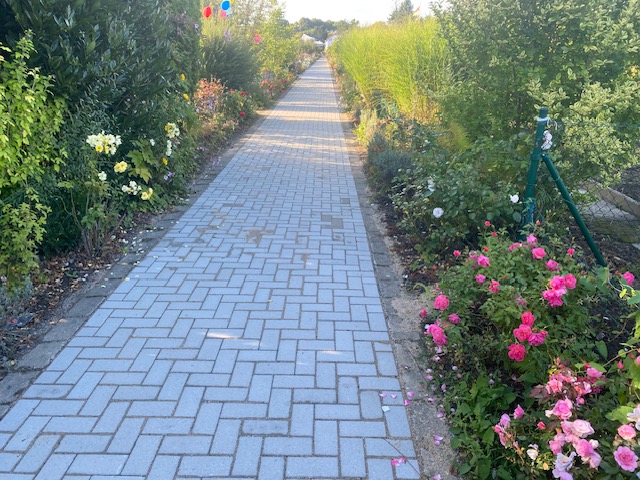 Die Gartenpächter und der Vorstand des Gartenverein "Fröhliche Morgensonne" sind sehr dankbar, dass ein Teilstück eines Gartenweges mit Steinen neu gepflastert werden konnte. In der Vergangenheit mussten sich die Gartenpächter oft quälen, um ihren Garten mit der Schubkarre oder dem Bollerwagen zu erreichen. Bei Regen oder Schnee war der sandige Boden so aufgeweicht, dass man stecken blieb. Jetzt schieben die Gartenpächter ganzfreudig die Schubkarre auf dem neuen Weg.